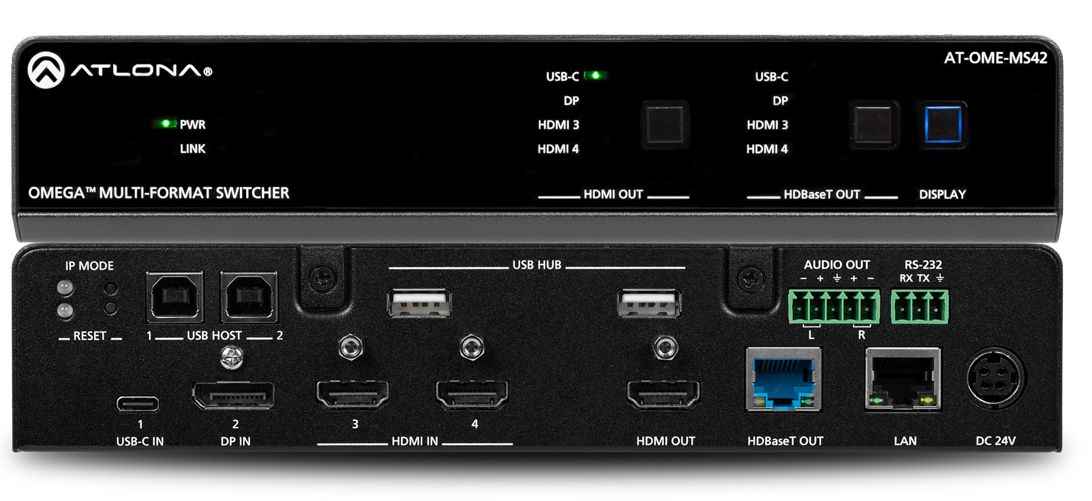 The Atlona AT-OME-MS42 is a versatile 4×2 matrix switcher and HDBaseT transmitter with HDMI, DisplayPort, and USB-C inputs, and mirrored HDMI and HDBaseT outputs. It’s perfect for video conferencing applications with built-in USB interfacing and extension to a display.Read More