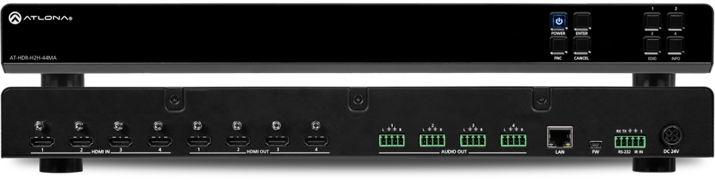(Note: The HDR-H2H-44MA de-embeds HDMI two-channel PCM audio. For extracting and downmixing Dolby® and DTS® audio, Atlona recommends the AT-HDR-M2C or AT-HDR-M2C-QUAD audio converters.)
