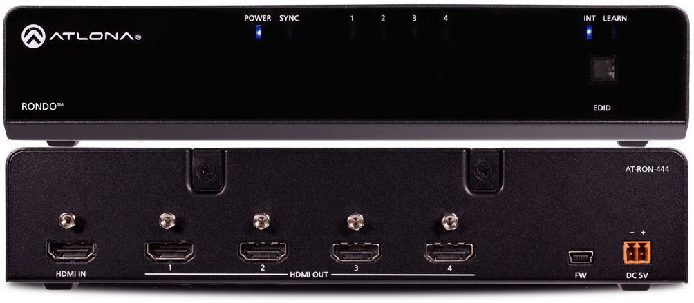The Atlona Rondo™ 444 (AT-RON-444) is a 1×4 HDMI distribution amplifier for high dynamic range (HDR) formats. Part of the comprehensive family of Atlona 4K HDR integration products, it is HDCP 2.2 compliant and supports 4K/UHD video @ 60 Hz with 4:4:4 chroma sampling, as well as HDMI data rates up to 18 Gbps. The Rondo 444 is ideal for applications requiring the latest as well as emerging 4K/UHD and HDR sources and displays. It is compatible with all video resolutions, audio formats, and color space formats supported in the HDMI 2.0b specification, plus the ability to pass metadata for HDR content. This Rondo Series HDMI distribution amplifier includes EDID management features, front panel LED indicators for power and signal status, and the capability to cascade several units without compromising performance.
