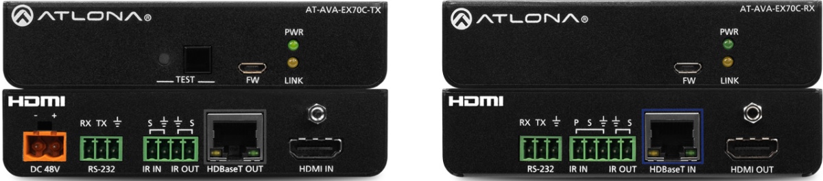 The Atlona AT-AVA-EX70C-KIT is an Avance™ Series HDBaseT extender kit that supports control pass-through and remote power capability. The kit transmits 4K/UHD 60Hz 4:2:0 video up to 130 feet (40 meters) or 1080p 60Hz video up to 230 feet (70 meters). In addition to video with embedded multi-channel audio, RS-232 and IR control signals, and remote power from the transmitter to the receiver are supported on the single Category 6/6A cable. EDID filtering and clock stretching ensure video transmission integrity and stable connections. Integrated HDBaseT link test allows quick verification of cable, termination, and link quality. The AT-AVA-EX70C-KIT includes both transmitter and receiver endpoints. Compact enclosures and included brackets allow the devices to be surface mounted in furniture or behind a display. The AT-AVA-EX70C-KIT delivers a cost-effective solution for extension of video, audio, control, and receiver power at resolutions up to 4K/UHD.